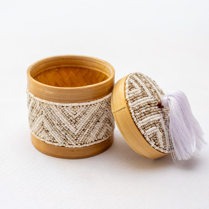 Elegant and distinctive handmade decorative box, crafted from natural bamboo and carefully embellished with small beads. The surface features a subtle geometric pattern, while the lid is finished with a decorative tassel that adds a light bohemian and Bali-inspired touch.