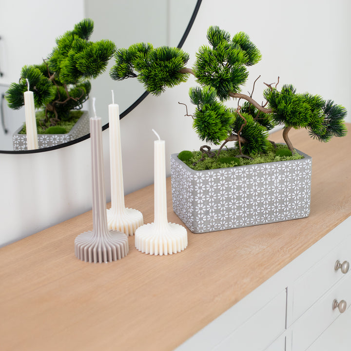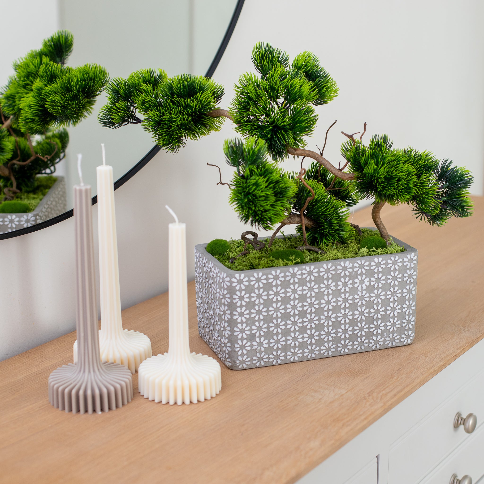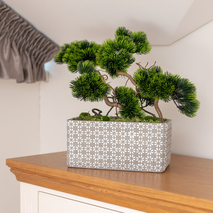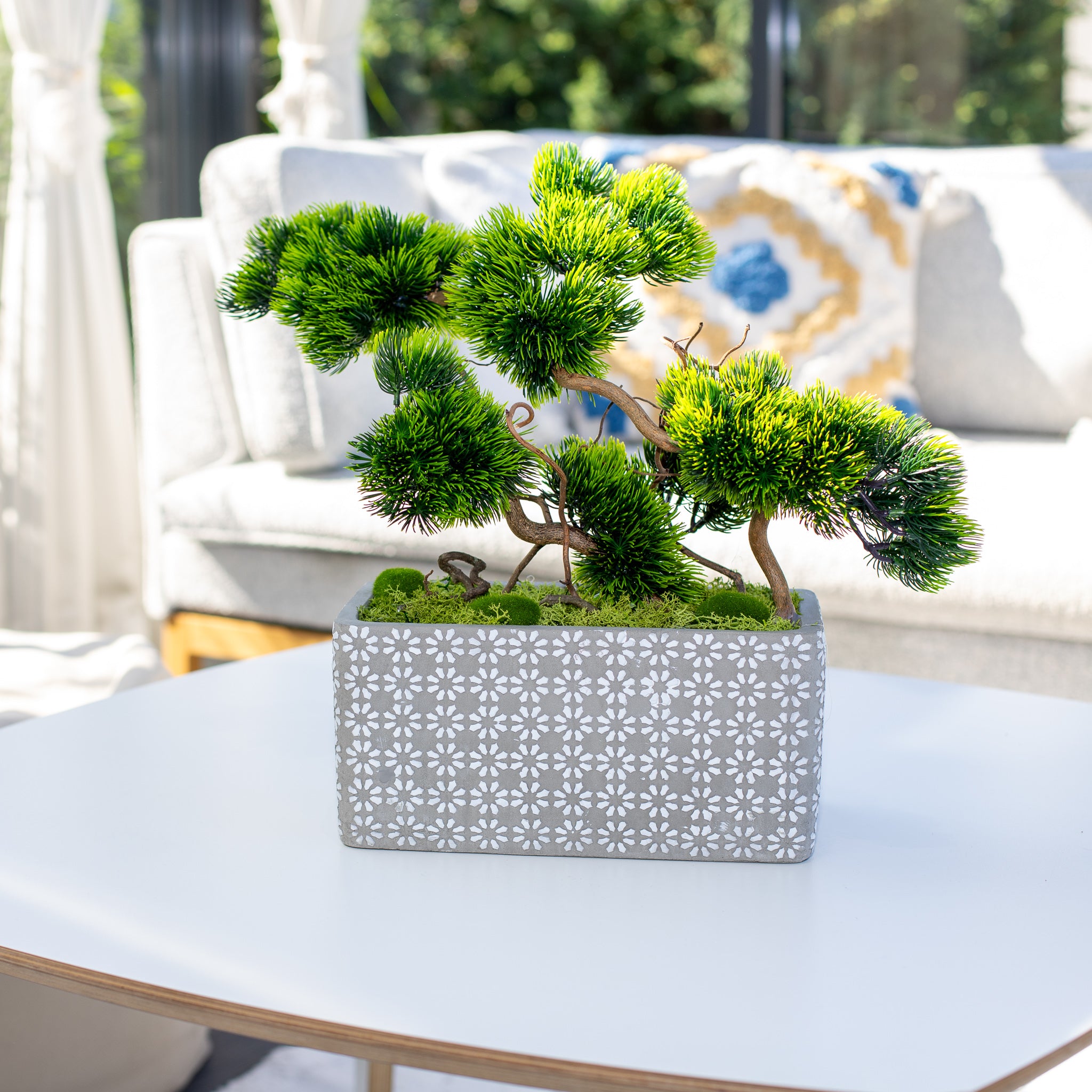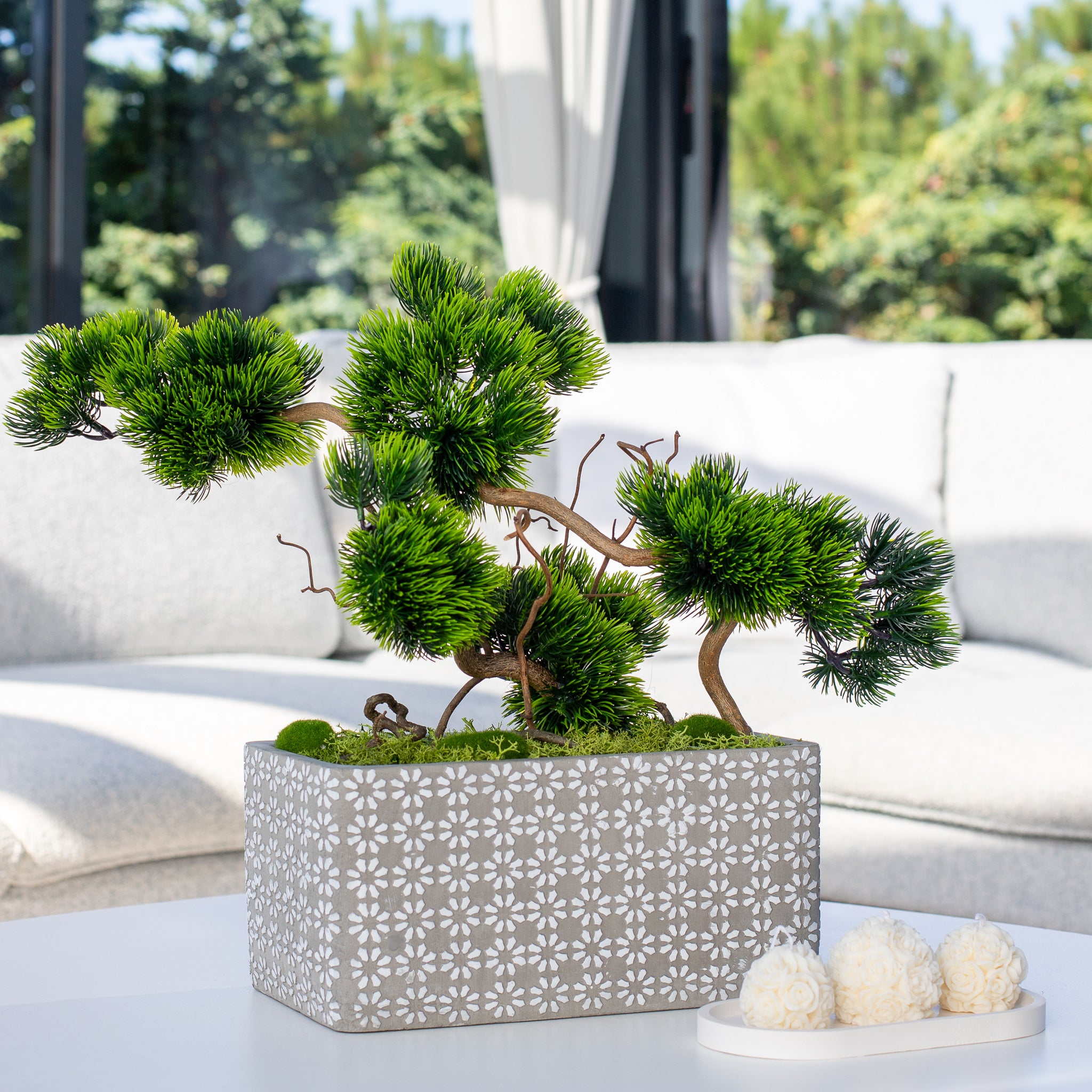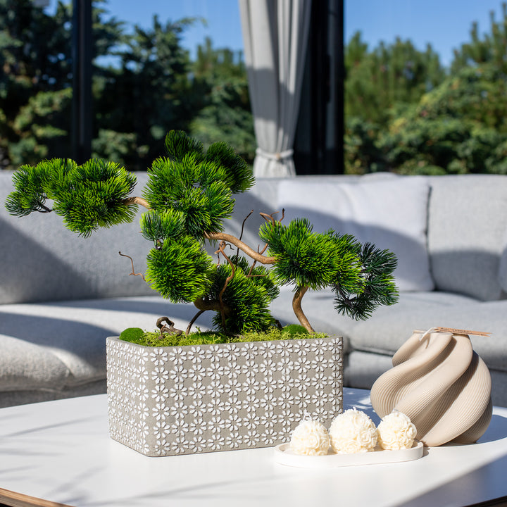 Bonsai pasižymi subtiliai išlenkta šaka, padengta tankiais ryškiai žaliais spygliukais, kurie atrodo itin natūraliai. Augalas įkomponuotas į modernų pilką vazoną, puoštą baltais gėlių raštais, todėl harmoningai dera tiek prie šiuolaikinio, tiek prie klasikinio interjero.