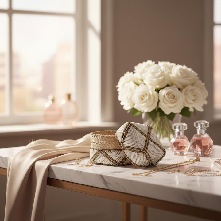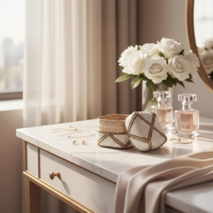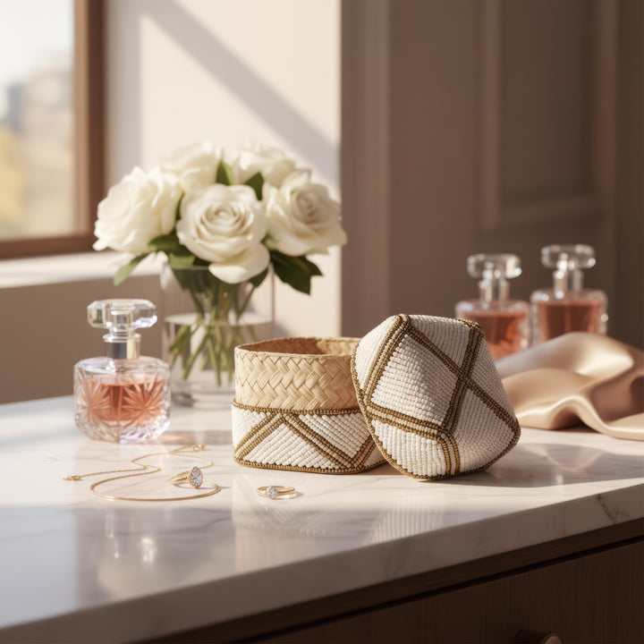 Dėžutė idealiai tinka papuošalams, aksesuarams ar kitoms smulkmenoms laikyti – tiek miegamajame, tiek vonios ar grožio erdvėje. Neutralios spalvos lengvai dera prie įvairių interjero stilių, o apvali forma suteikia jaukumo ir rafinuotumo.