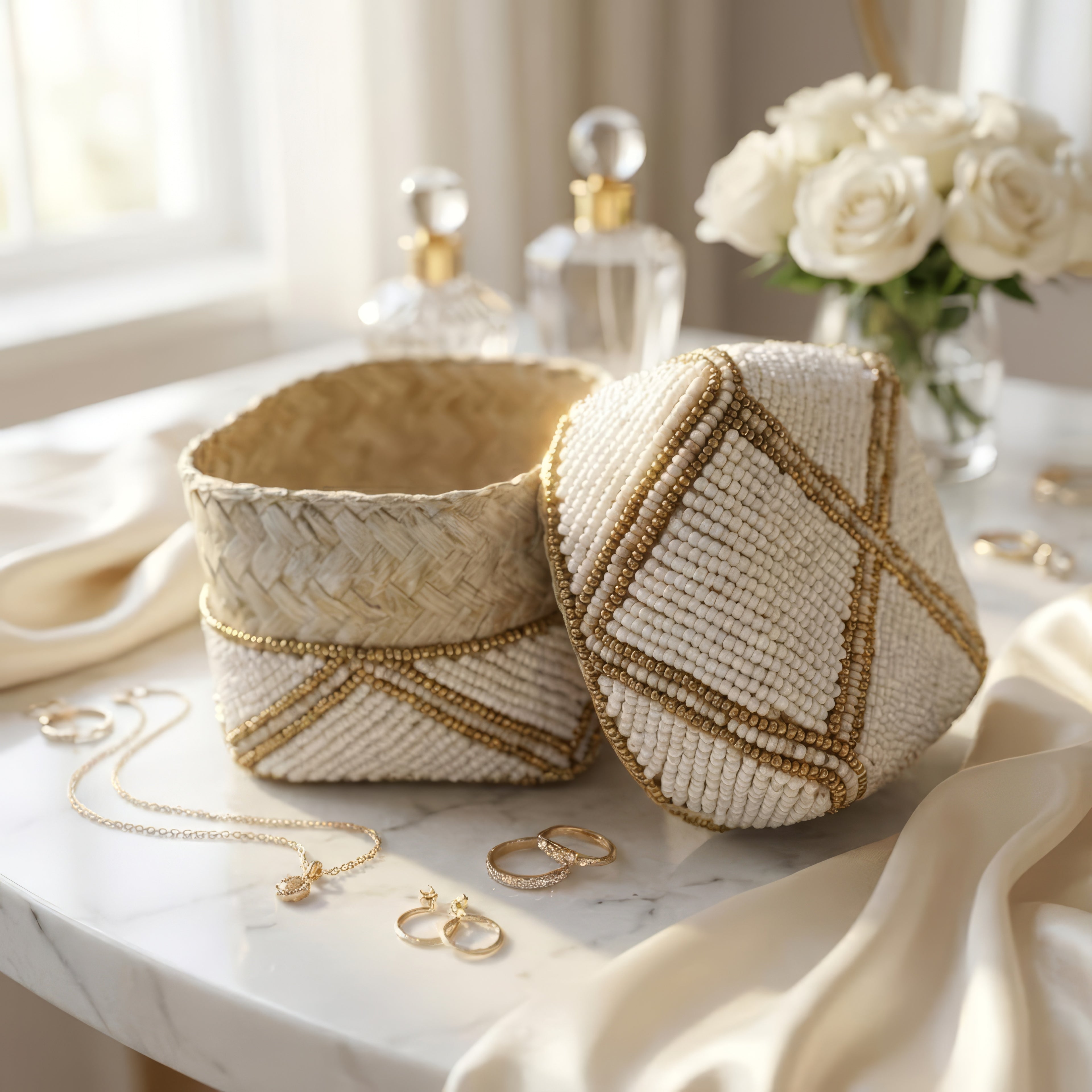 Ši elegantiška rankų darbo stiliaus dėžutė – tai subtilios prabangos ir natūralaus grožio derinys, puikiai tinkantis šiuolaikiniams namams. Pagaminta iš natūralių pintų medžiagų ir dekoruota švelniais kriauklių akcentais, ji išsiskiria lengvumu, tekstūra ir estetine harmonija.