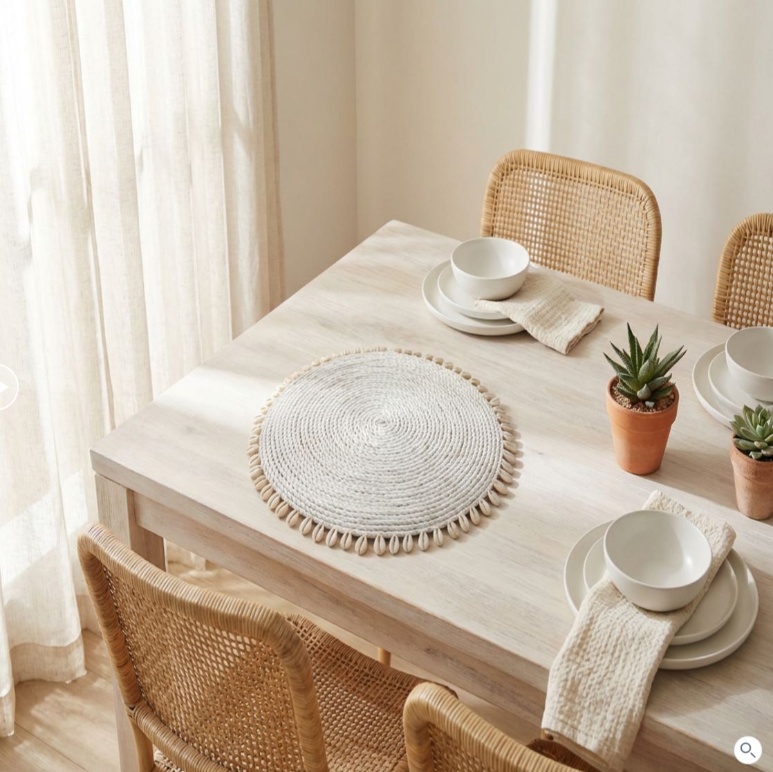 Šis stilingas apvalus stalo padėkliukas su natūralių kriauklių apdaila suteikia stalui jaukumo, šilumos ir lengvos pajūrio nuotaikos. Rankų darbo įkvėptas dizainas ir švelnūs, natūralūs atspalviai puikiai dera boho, pajūrio, skandinaviško ar natūralaus stiliaus interjeruose.
